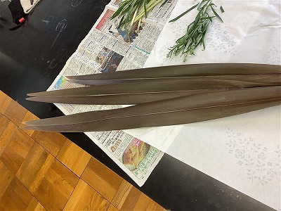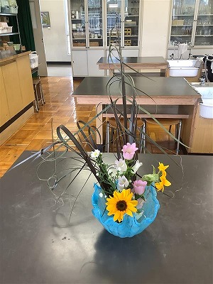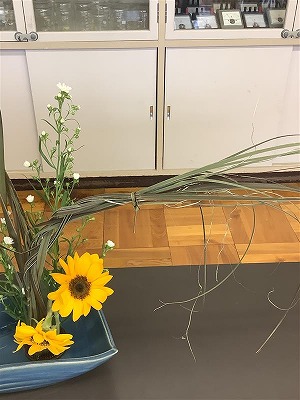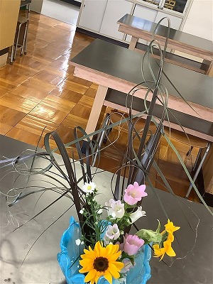 今回の花材は、赤ニューサイラン、ヒマワリ、カンパニュラ、クジャクソウでした。