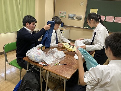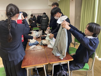 東星バザーで服の回収を行った後、中学2年生と3年生が服を分類し、丁寧に畳みました。
