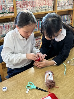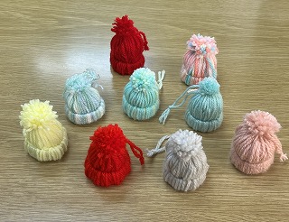 仮入部では、ペットボトルキャップと毛糸を使った、かわいらしい帽子のストラップを作りました。
