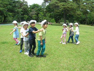 しばらくすると、広い遊び場に着きました。ここで、〇✕ゲーム、ジャンケン列車、1年生リレー(2年生が1年生の名前が書いてある紙を持って1年生の所まで走り、手を繋いで走って戻る)や、震源地ゲーム、花いちもんめ等の遊びをしました。