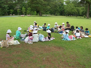 11時半頃、少し早いお弁当タイム。芝生にレジャーシートを広げ、子どもたちはおいしそうにお弁当を食べていました。