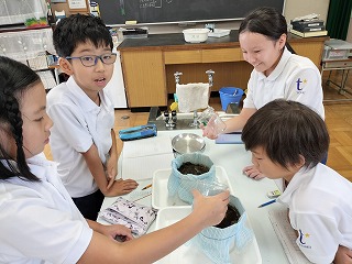 その中の、「しみこむ」という意見に着目し、水のしみこみ方は、土のつぶの大きさによって変わるかどうか、の実験をしました。