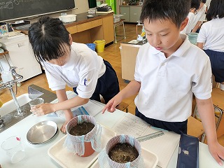 しみ出た水の量も比べ、記録して、実験は終了。