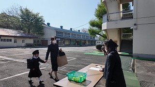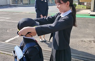 緊張した面持ちで登校してくる1年生を迎えたのは、同じく少し緊張気味の6年生たちです。