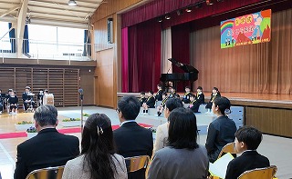 6年生の心のこもった器楽合奏に合わせて、1年生が体育館へと入場しました。
